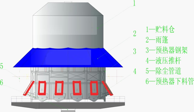 主要包括上部料倉、下料溜槽、料倉支架及結(jié)構(gòu)。保證在向預(yù)熱器本體內(nèi)給料時實(shí)現(xiàn)安全密閉,這樣外界的冷空氣不能進(jìn)入到預(yù)熱器內(nèi),并且供料可以借助棒條閥實(shí)現(xiàn)連續(xù)或間斷給料。